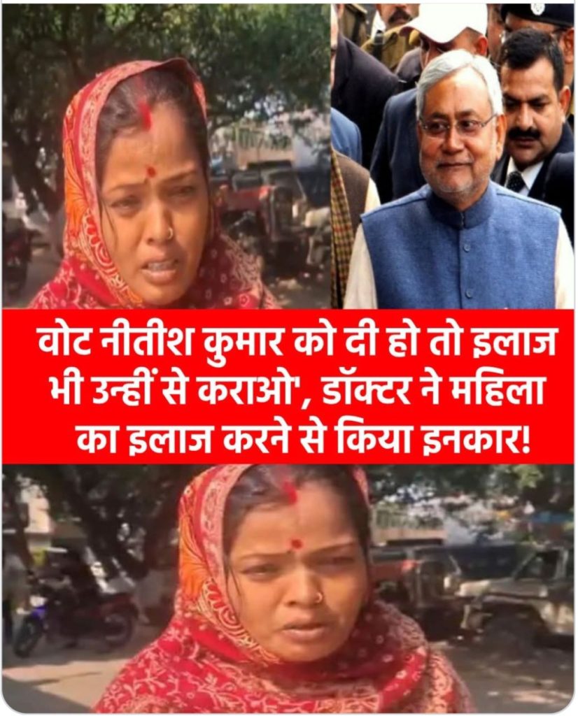 महिला ने अस्पताल के बाहर आकर आरोप लगाया कि वह जब इलाज के लिए पहुंची तो ड्यूटी पर तैनात डॉक्टर ने कहा कि हम तुम्हारा इलाज नहीं कर सकते है. तुम्हारा इलाज नीतीश कुमार करेंगे, वोट नीतीश कुमार को दिए हो. महिला ने जवाब देते हुए कहा कि पैसा एक जात को नहीं बल्कि हर जात को मिला है. तब जाकर उसे एक सूईं लगाई गई.
